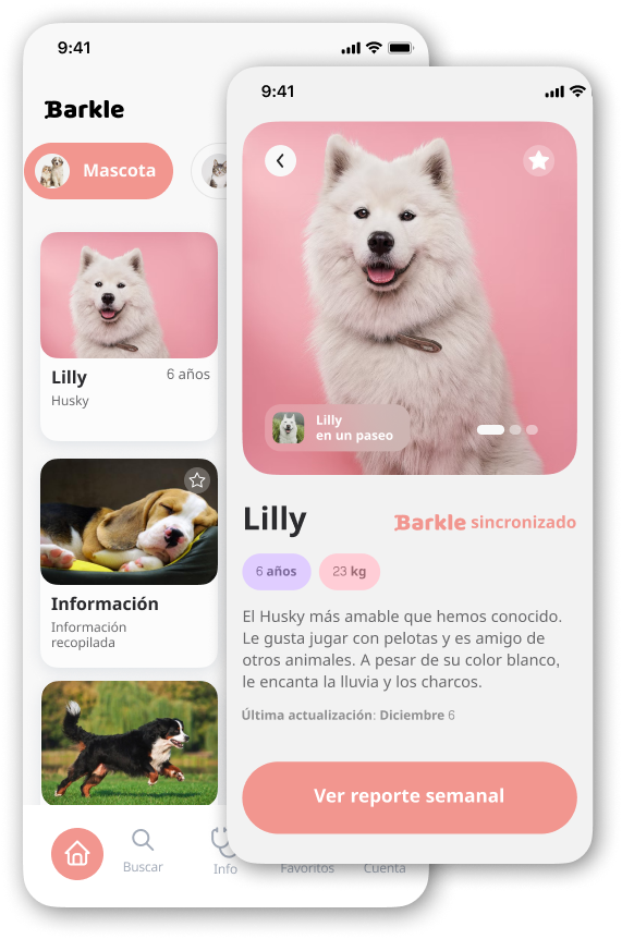 Todo lo que tu perro hace, en la palma de tu mano. Con Barkle, convertimos cada paso, juego y descanso en datos que te ayudan a entender mejor su bienestar. ¡Porque cuidar nunca fue tan fácil (ni tan tecnológico)!